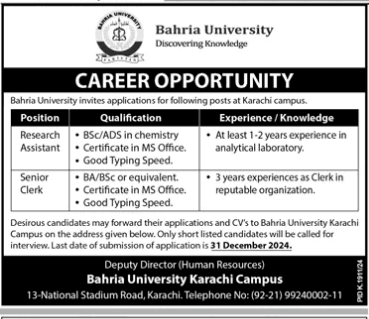 Bahira University id dedicated to academic excellence and professionals growth. We are currently accepting applications for the following positions at our Karachi Campus in our team and be part of a progressive academic environment. Bahira University Karachi Campus invites application for the following positions: Research Assistant and Senior Clerk. The Research Assistant requires a BSc/ADS in chemistry with 1-2 years experience in an analytical laboratory, along with proficiency in MS Office and good typing speed. This role involves supporting research activities, data analysis, and maintaining records.
