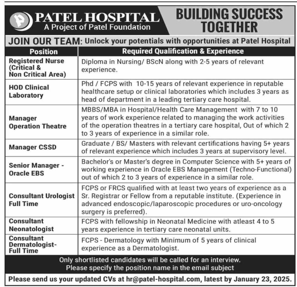 Patel Hospital is seeking dedicated and qualified professionals to join our growing team. We offer a career opportunity to healthcare and patients care we dedicated healthcare and we provide staff good workplace and environment. Following Available positions in the list: