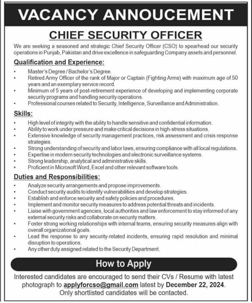 We are seeking a seasoned and strategic Chief Security Officer (CSO) to spearhead our security operations in Punjab, Pakistan and drive excellence in safeguarding Company assets and personnel. The ideal candidates will be a retired military’s officer (major/Captain) with strong leadership skills, practical knowledge of security systems, and a proven track record in risks managements and crisis resolution