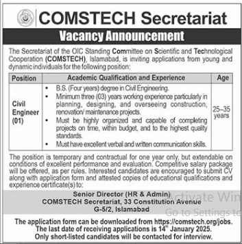 The comstech Secretariat, part of the organization of Islamic Cooperation (OIC) standing committee on scientific and technological Cooperation, based in Islamabad, invites applications from skilled ,motivated, and dynamic professionals for the following positions: