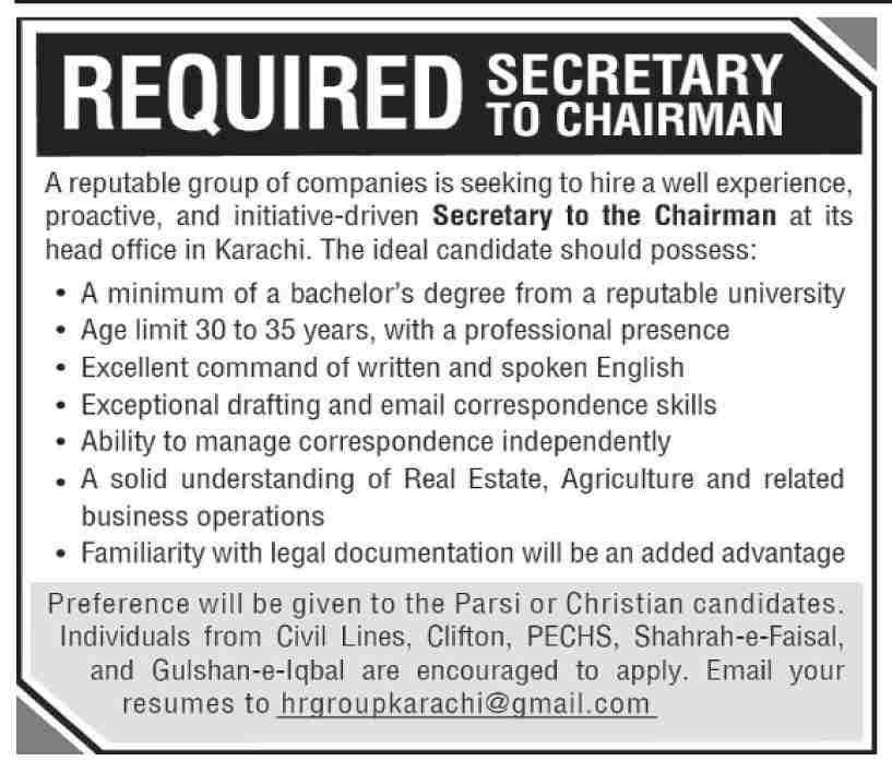 A leading company in Karachi is looking for a dedicated and skilled Executive Secretary to assist its Chairman ib daily operations and communications. A reputable organization is looking for a highly organized, proactive, and professionals individual to join as a Secretary to the Chairman at its Karachi head office. This positions requires an individuals with excellent communication, multitasking, and problem-solving abilities to provide comprehensive support to the chairman. The Secretary will be responsible for drafting and managing correspondence independently maintaining professional email communications, and organizing schedules and meetings. The candidates will also play a key role in assisting with administrative functions and ensuring smooth operations on a day to day basis. A strong understanding of Real Estate, Agriculture, and related business operations is essential, as the role involves coordinating with various departments and supporting the chairman in decision-making processes. Additional, experience in handling legal documentation will be an added advantage, ensuring compliance with organizational policies and legal standards. The ideal candidates should exhibit strong interpersonal skills. posses exceptional written and spoken English proficiency, and maintain a professionals demeanor. The ability to manage tasks independently, adapt to new challenges, and maintain confidentiality is critical for success in this role.