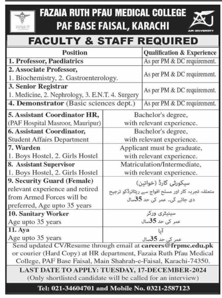 Fazaia Ruth Pfau Medical College, a leading medical institutions located at PAF base Faisal in Karachi, is looking to hire qualified and dedicated professionals for various faculty and staff position. We invite applications from individuals who are passionate about education, healthcare, and contributing to the success of a prestigious institution.