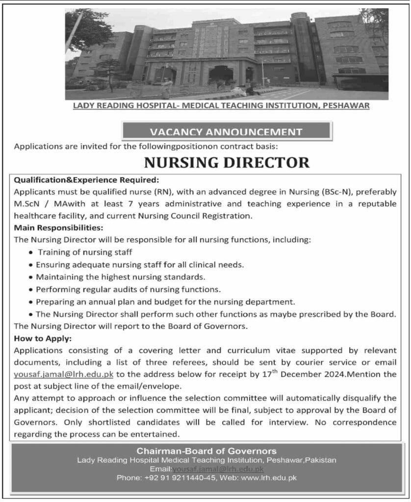 The Lady Reading Hospital (LRH), a premier medical teaching institution in Peshawar, invites qualified and experienced professionals to apply for the contractual positions of Director of Nursing. This is a unique opportunity to join a renowned institution that upholds excellence in patient care , education, and research.