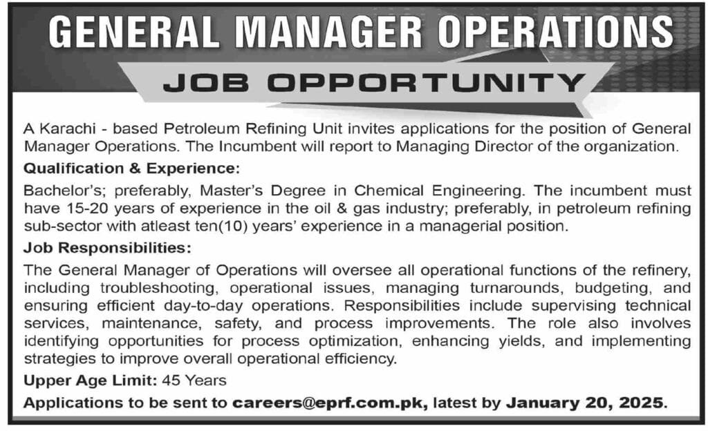 A reputable Karachi- based Petroleum Refining Unit seeking a seasoned professionals for the position of General Manager operations. The Organization is committed to excellence in the oil and gas sector, offering a dynamic and innovate work environment with a focus on operational efficiency and sustainability.