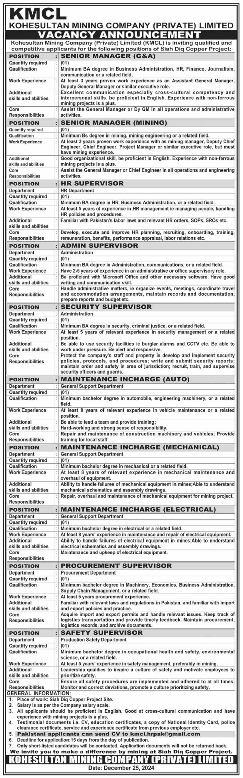 Are you ready to advance your career with a dynamic mining company? KMCL is hiring for various positions at its mining project site located un District Khuzdar, Balochistan. Join a reputable organization committed to excellence, safety, and professional growth.