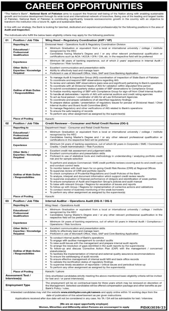 The National Bank of Pakistan is seeking qualified professionals for three positions in Karachi. The roles require various level of education, including a Master degree or relevant certifications, along with extensive experience in banking, audit, credit risk, and regulatory compliance. These positions involves responsibilities such as regulatory coordination, credit portfolio reviews, and internal audit. Interested candidates must meet the eligibility criteria and apply through the Bank official platform. The positions are based on Karachi, with some in Lahore, and are offered on a 3 years contract based in Karachi, renewable at the bank direction. The bank is an equal opportunity employer, encouraging applications from women, minorities, and differently-abled individuals.