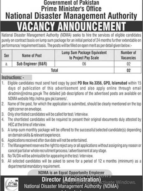 The National Disaster Managements authority (NDMA) Is inviting applications from qualified candidates for contract -based positions. Initially offered for 24 months, the contract period is extendable based on performance and project requirements.