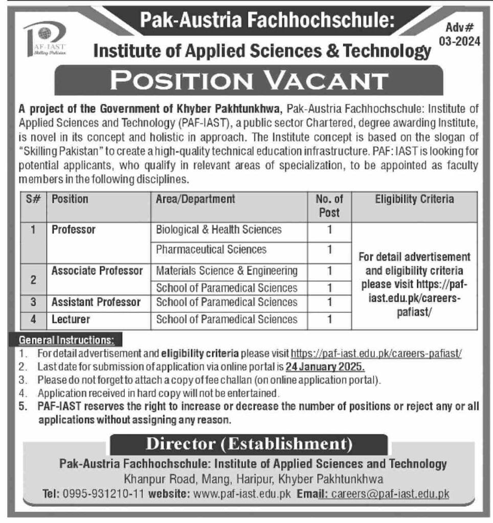 Pak Austria Fachhochschule Institute of applied science and Technology (PAF-IAST), located in Haripur, Khyber Pakhtunkhwa, is a premier degree-awarding institute established under the government of Khyber Pakhtunkhwa. This public sector institute operates with the vision of providing state-of-art technical education in Pakistan. Know for its holistic and innovative approach, PAF-IAST is a key part of the skilling Pakistan initiative, aimed at equipping the workforce with specialized knowledge and skills to meet global challenges. PAF-IAST invites application from experienced and qualified candidates to join its dynamic faculty team. Applicants are sought for teaching and research roles in various discipline , with a focus on academic excellence, innovation, and capacity building in higher education.