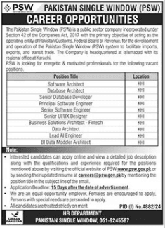 The Pakistan Single Window (PSW), a public sector company operating under the Federal Board of Revenue (FBR), Invites application’s from energetic and motivated professionals for various positions. PSW is responsible for developing and managing the PSW system to facilities imports, exports, and transit trade. The company head office is located in Islamabad, with a regional office in Karachi.