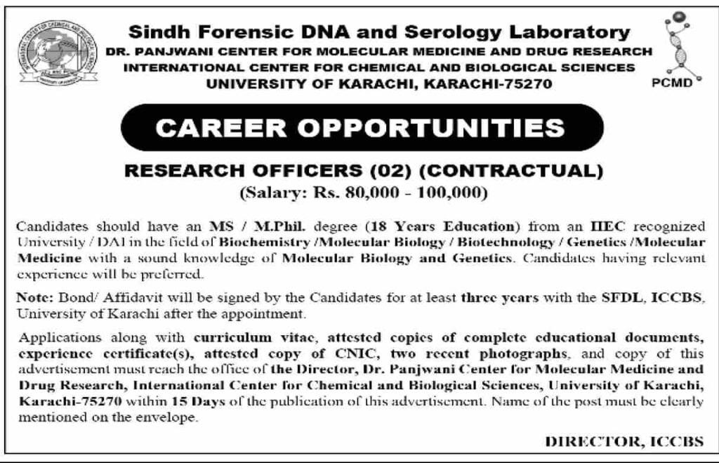 Applications must reach the Director, Dr. Panjwani Center for Molecular medicine and Drug Research, ICCBS, university of Karachi, within 15 days of this advertisement publications. The job title must be clearly mentioned on the envelope. This is a great opportunity for professionals looking to advance their careers Biomedical research and forensic sciences. Apply now be a part of prestigious research institute.