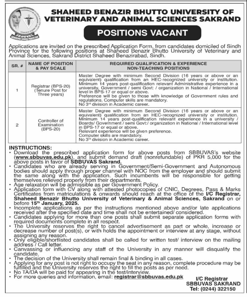 Shaheed Benazir Bhutto University of Veterinary and Animal Sciences (SBBUVAS), located in Sakrand, District Shaheed Benzirabad, Sindh, invites applications for non-teaching positions from qualified candidates domicile in Sindh Province for the positions. For the post of Registrar, candidates must posses Master degree with at least second division (16 years of education) from an HEC-recognized institution. Application should have a minimum of 14 years of post-qualification administrative experience at BPS-17 or higher in a recognized university, government, or Sami-government organization. Knowledge of government rules and proficiency in computer application is mandatory. For the positions of Controller of Examinations, candidates must have a Master degree (minimum second division. 16 years of education) from an HEC-recognized institution with at least 14 years or relevant experience at BPS-17 or above. Applicants with prior examination-related experience will be preferred. Computer skills are essential for both positions, and no third division in academic records be accepted.