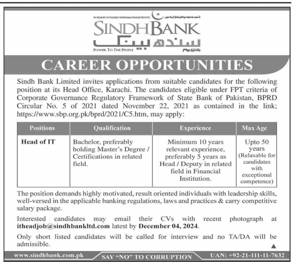 Sindh Bank Limited, a leading financial institution in Pakistan, is offering an exciting career opportunity for qualified individual to join its team at the Head Office in Karachi. We are seeking to fill the position of Head of IT. this is an excellent opportunity for experience and a passion for technology and banking. Sindh Bank has been playing a crucial role in the country financial sector, providing innovate services and supporting the economic development of Pakistan. With a robust foundation and a forward-thinking approach, we continue to grow and adapt to the changing needs of the financial world. As part of our ongoing expansion, we are inviting applications from eligible candidates who meet the criteria defined under the corporate Governance Regulatory Framework to financial institution.