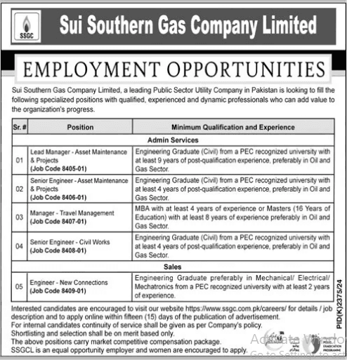 Interested candidates should visit hhtps;//www.ssgc.com.pk/career/ to view detailed job descriptions and apply online within 15 days of the advertisement publication. candidates are advised to ensure their applications are complete and submitted on time.