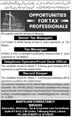 Baig Law Consultancy Services, Tax Professionals Jobs 2025 a leading firm specializing in tax, corporate law, and legal consultancy, is hiring talented tax professionals for multiple positions. if your passionate about tax consultancy and legal services, we invite you to apply and grow with us.