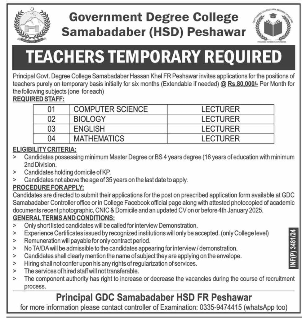 The Principal of Govt. Degree college Samabadaber Hassan Khel, Peshawar invites applications for Temporary teaching positions initially for six months, extendable if necessary. The positions offer a competitive salary of Rs. 80,000 per month.