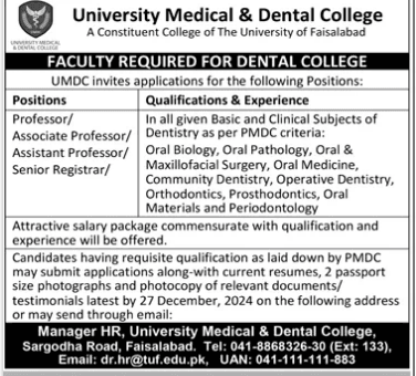 A constituent College of The University of Faisalabad University Medical Dental College (UMDC) is a premier institution dedicated to providing high quality education and training in the medical and dental fields. We are currently inviting applications for faculty positions in our Dental College, aimed at strengthening our academic team and enhancing the learning experience of our students. The available roles are in various dental disciplines and offer a rewarding opportunity for professionals seeking to contribute to the advancement of dental education.