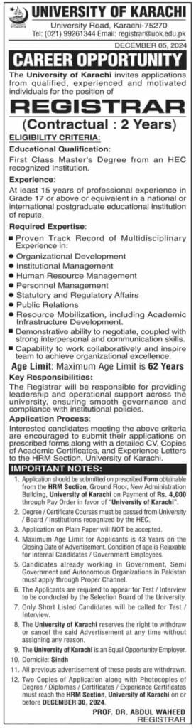 The University of Karachi, a leading institution of higher learning and research in Pakistan, is seeking highly qualified, experienced, and motivated candidates for the position of Registrar. This role is an excellent opportunity for professionals who are passionate about education and institutional development to contribute to the advancement of one of Pakistan most prestigious universities.