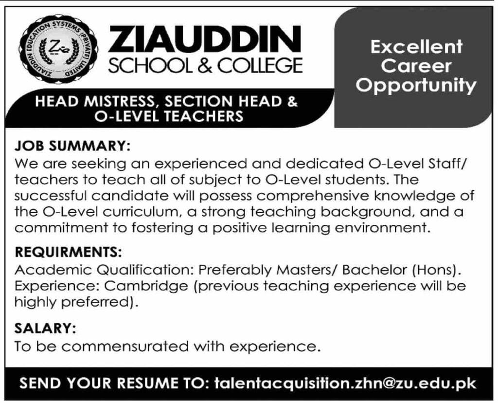 Ziauddin School and College is inviting applications for multiple positions, including Headmistress, section Head, and O-Level Teachers.